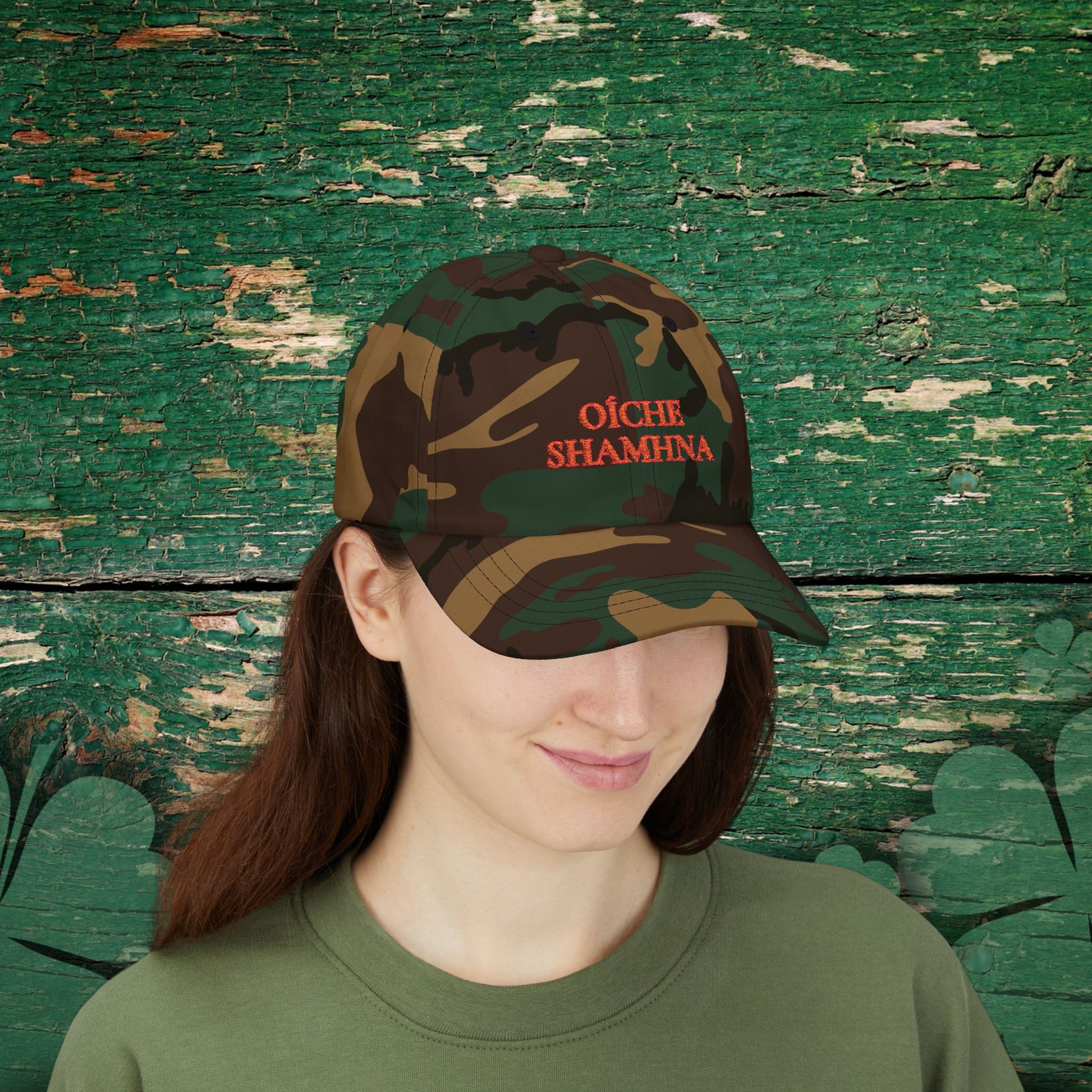 Mark Halloween the Irish way with the Oíche Shamhna cap. Embroidered in bold red on camouflage, this heritage piece ties modern streetwear with Celtic tradition. Perfect for Samhain gatherings, bonfires, or year-round Gaeilge pride.